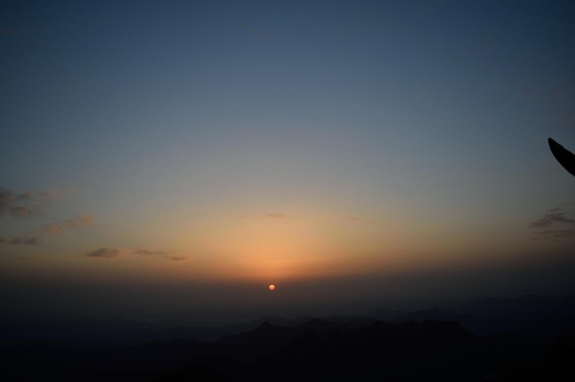 翌日凌晨三點,酒店外漆黑一片,偶有燈光,看到很多游客也相約凌晨爬山。我們也整裝向金頂出發(fā),一路上攀爬辛苦,也無法欣賞沿山美景,但卻是一種全新的體驗。隨著大家的步伐,海拔逐漸升高,霧漸在腳下,天空由灰漸藍(lán),一切清新縹緲。天空中出現(xiàn)一絲絲彩霞,太陽也從云層里露出了笑臉,日出美極了,遠(yuǎn)處的山峰也若隱若現(xiàn),三個小時便登上了金頂,海波1612米的地方,站在武當(dāng)之巔,俯視眾生,或閉目冥思,感悟天下大道!
