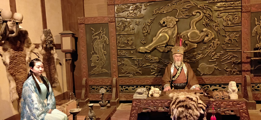 之后我們返回當(dāng)陽頭碼頭登船前往燈影閣碼頭,乘坐扶梯去往巴王寨。巴王寨是用石頭、原木和泥土作為原材料建筑而成,記錄并呈現(xiàn)了一個(gè)民族從興盛到衰弱的歷史過程,沿路看到磨石、雕刻等具有農(nóng)耕風(fēng)情的巴人生活,古色古香。然而老天下起了雨,大家狼狽前行,錯(cuò)過了燈影石的好風(fēng)光。不過有兩位穿著巴人服飾的大叔在雨中駐守于巴王宮外,繼續(xù)扮演他們的“角色”,相當(dāng)敬業(yè)。巴王宮內(nèi)刀槍劍戟擺在中堂兩側(cè),一股肅殺之氣沖天而起,巴王端坐在殿中,旁邊是巴王女兒。雖然這是人造的仿古景點(diǎn),但似乎有那么點(diǎn)意思。聽另一位導(dǎo)游說,如果不下雨的話,每天都會(huì)有古巴人風(fēng)情的仿古舞蹈表演,很好看,不禁感到遺憾。不過我們還聽了蘭曲,看了十分鐘的女書小劇場,各有特色。