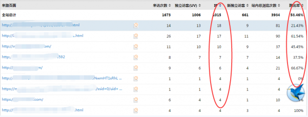 在這里,我們主要觀察提供IP數最多的這些頁面,跳出率如何。如果發現大量頁面的跳出率達到60%以上的時候,就需要考慮對網站進行微調了。因為這些頁面提供做了最多的流量,很大程度上直接影響著網站的整體數據。一般來說,跳出率在20%-40%之間是比較正常的。