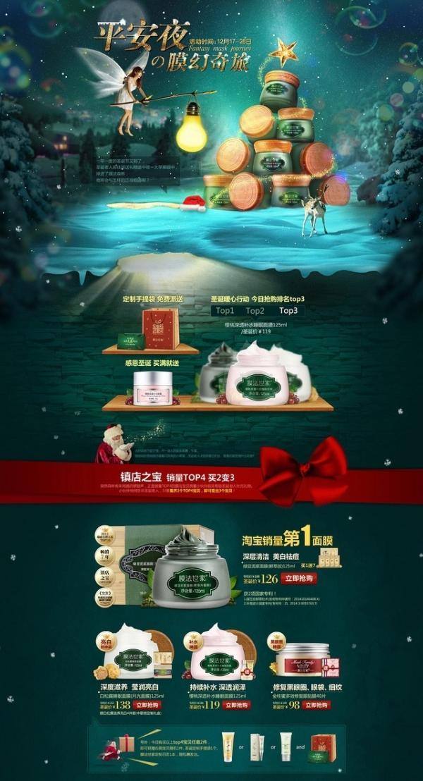 能夠將節日與自身的產品相結合形成創意,比只是簡單的場景搭建貨產品堆砌要高級的多。阿芙加的圣誕頁面設計可以推薦給大家看一下,將面膜堆成圣誕樹的樣式,延續一貫的夢幻畫風。如圖4: