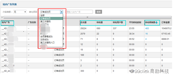 (2)A廣告位在實現的轉化項目(如注冊成功、訂單成功等),所帶來的點擊量、轉化量、轉化明細等數據;